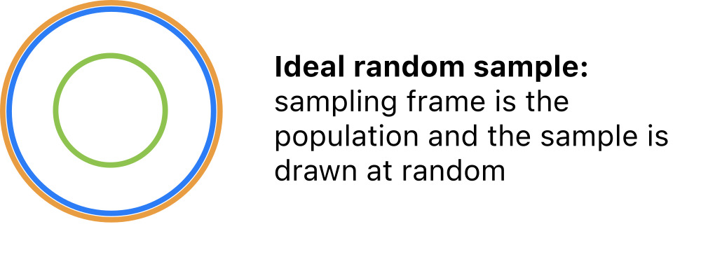 We can now imagine a few common sampling scenarios by varying the relationship between population, frame, and sample.