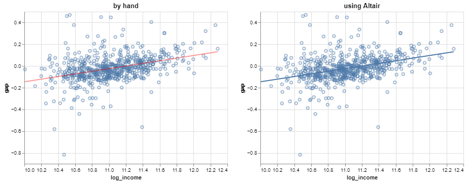 # center log median incomeincome = np.exp(regdata.log_income) income_shifted = income - income.min()log_income_shifted = np.log(income_shifted +1)# form x matrixx_shifted = sm.tools.add_constant(log_income_shifted)# refit modelslr_shifted = sm.OLS(endog = y, exog = x_shifted)beta_hat_shifted = slr_shifted.fit().params# display parameter estimatesprint('coefficient estimates: ', beta_hat_shifted)print('error variance estimate: ', slr_shifted.fit().scale)