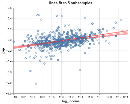 We can explore this idea a little by calculating least squares estimates from several distinct subsamples of the dataset.